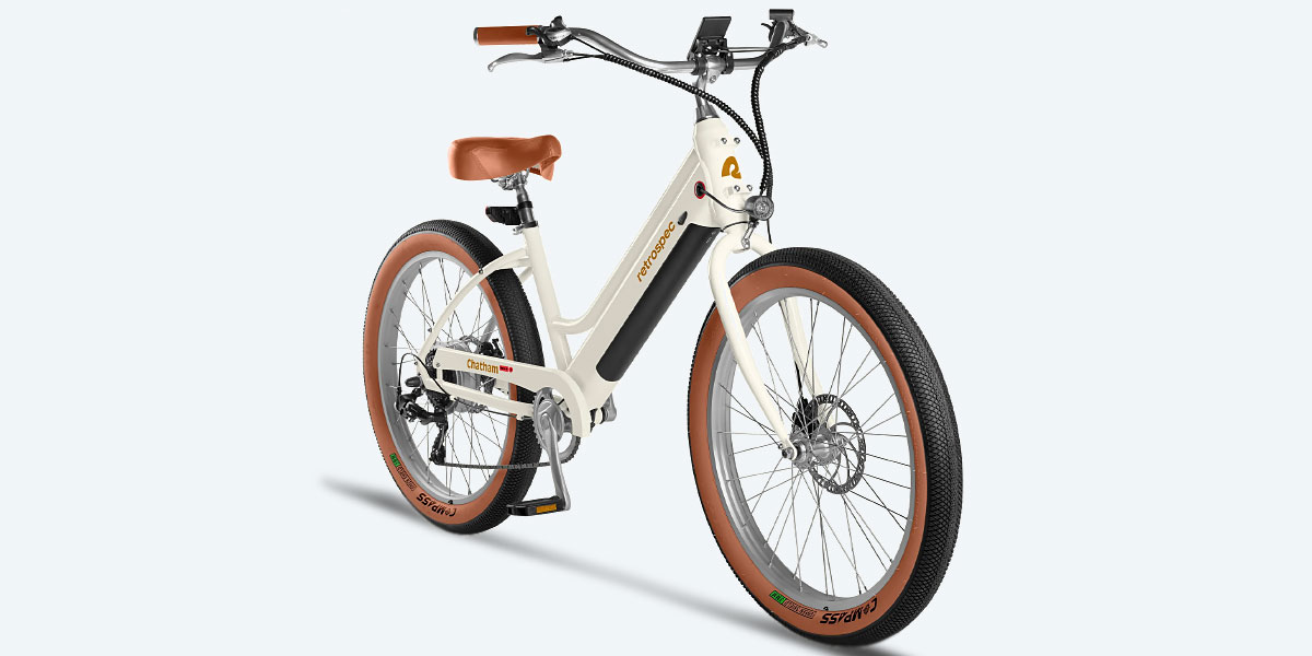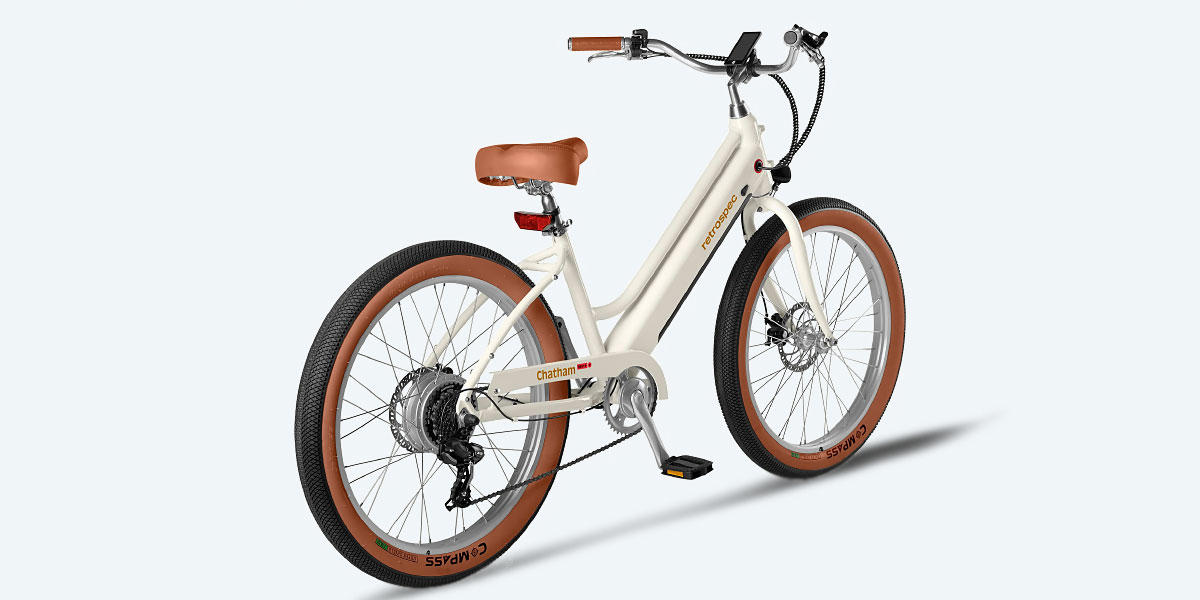 The Chatham Rev+ Beach Cruiser - Step Through is a US-made electric cruiser bike with a 500W motor, 0.5 kWh battery, and a top speed of 32 km/h (20 mph). It delivers up to 83 km (52 miles) of range and features a retro step-through frame for easy riding comfort.