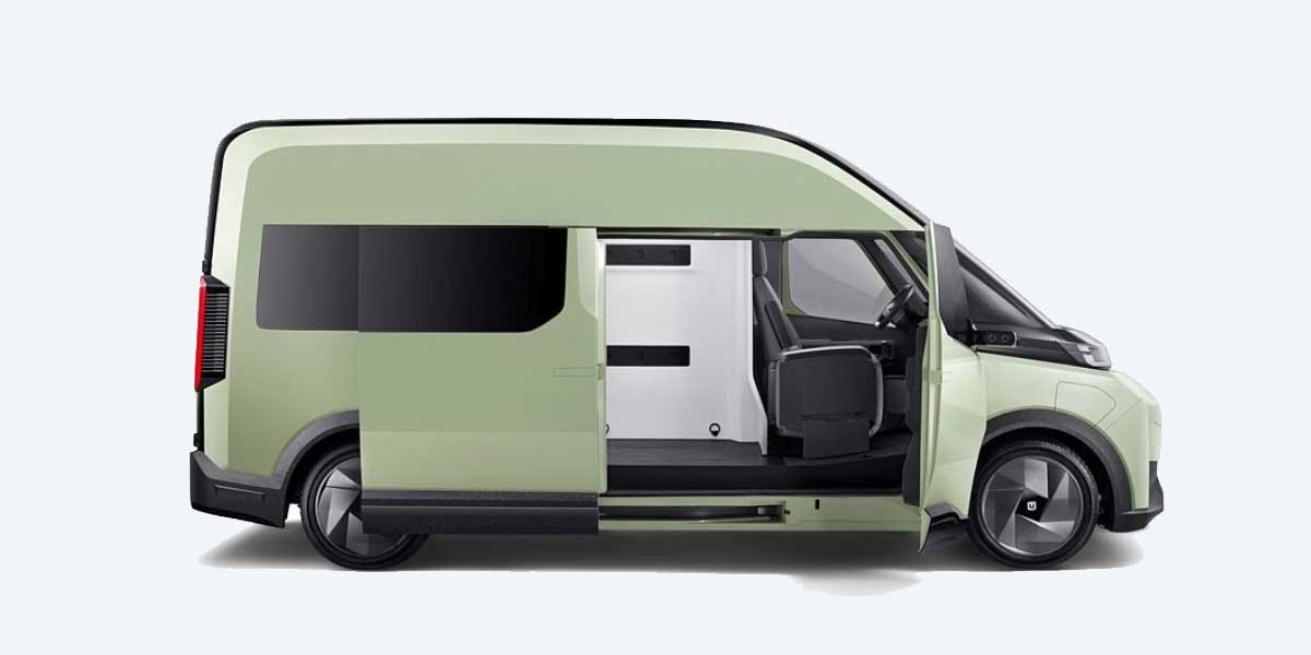 Seating is configurable from 4 to 9 occupants, making it a versatile bus-type EV suitable for shuttles or fleet duties.
