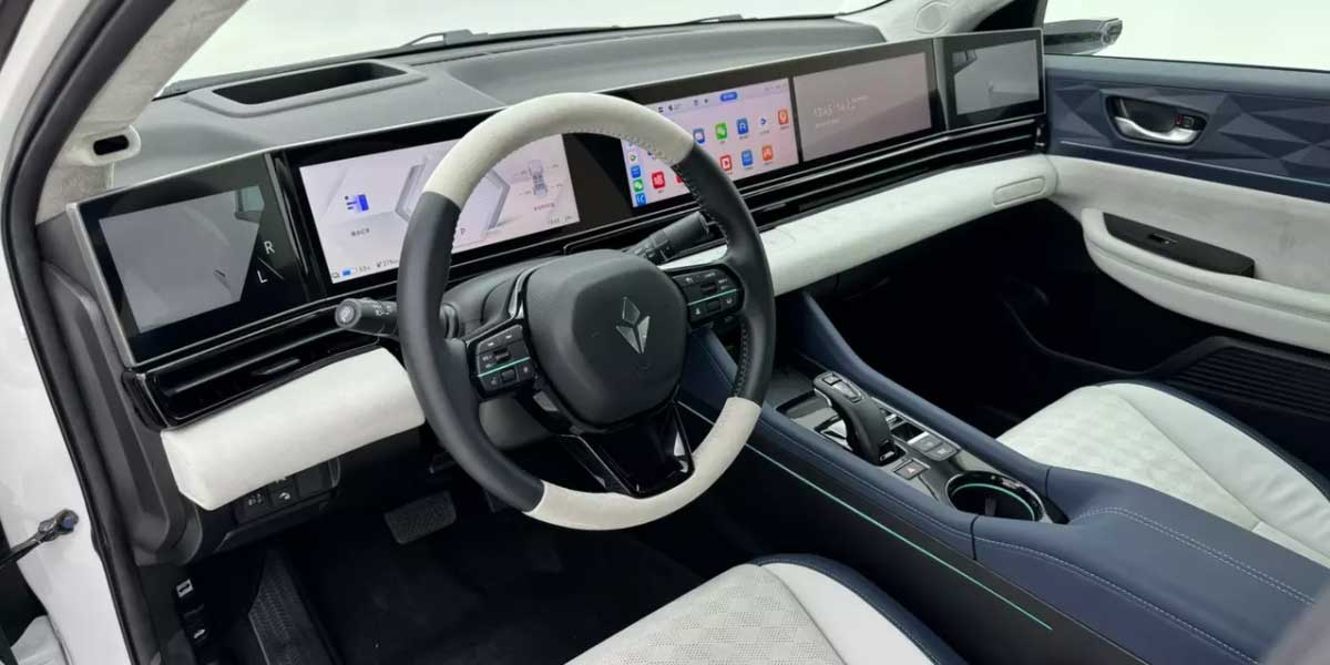 Stepping inside the Lingxi L, you are greeted by a traditional round steering wheel and a high-tech environment with five screens. These include a fully digital instrument cluster, a central control screen, an entertainment display for the passenger, and screens for the digital mirrors. The head-up display (HUD) projects vital information such as speed, navigation, and road signs directly onto the windshield. Other impressive features include tire pressure monitoring, facial recognition login, ambient lighting, autonomous parking, and adaptive cruise control.