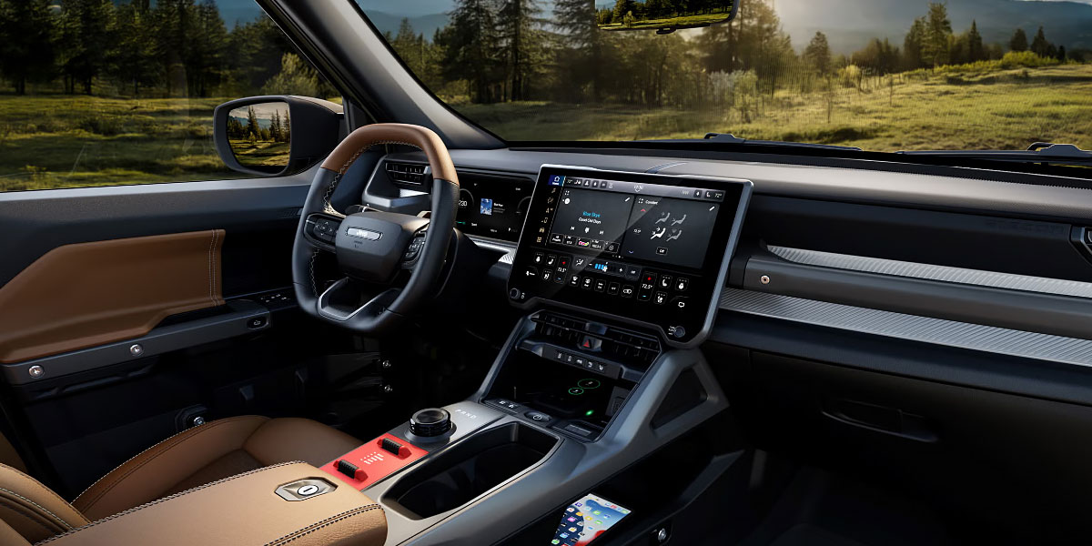 Inside, the cabin favors durability with a premium edge. Dual digital displays include a 12.3 inch driver cluster and a 14.5 inch Uconnect 5 touchscreen. Physical switches remain for drive modes and climate control. Seating accommodates five passengers with synthetic leather surfaces, heated front seats, and reinforced grab handles for uneven terrain.
