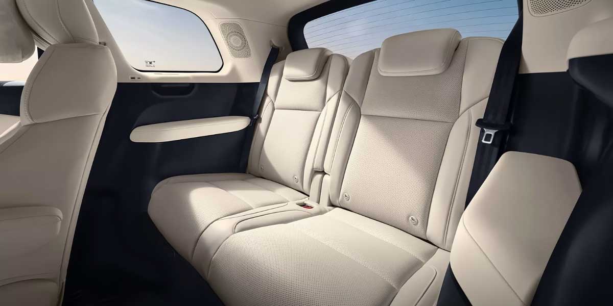 The Leapmotor С16 interior emphasizes comfort and technology. The front panel features a large multimedia tablet in the center, flanked by minimal physical buttons and a small display for the driver. The two-spoke steering wheel and integrated wireless charging pad for smartphones add to the modern appeal. Rear-seat passengers benefit from a built-in "TV" in the ceiling, enhancing the overall entertainment experience. The 2+2+2 seating layout ensures ample space and comfort for all occupants.
