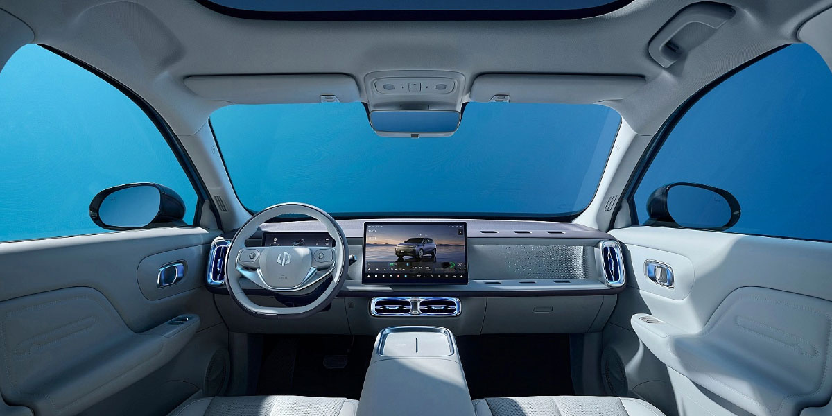 Inside, a floating infotainment screen dominates the dashboard, backed by a digital instrument cluster. The clean layout and suede leather upholstery give the interior a premium touch for its price. The wheelbase of 2,735 mm (107.7 in) creates solid legroom for five passengers, and cargo capacity around 400 liters (14.1 cu ft) is practical for daily runs. Optional LiDAR enhances driver-assistance capabilities on higher trims.
