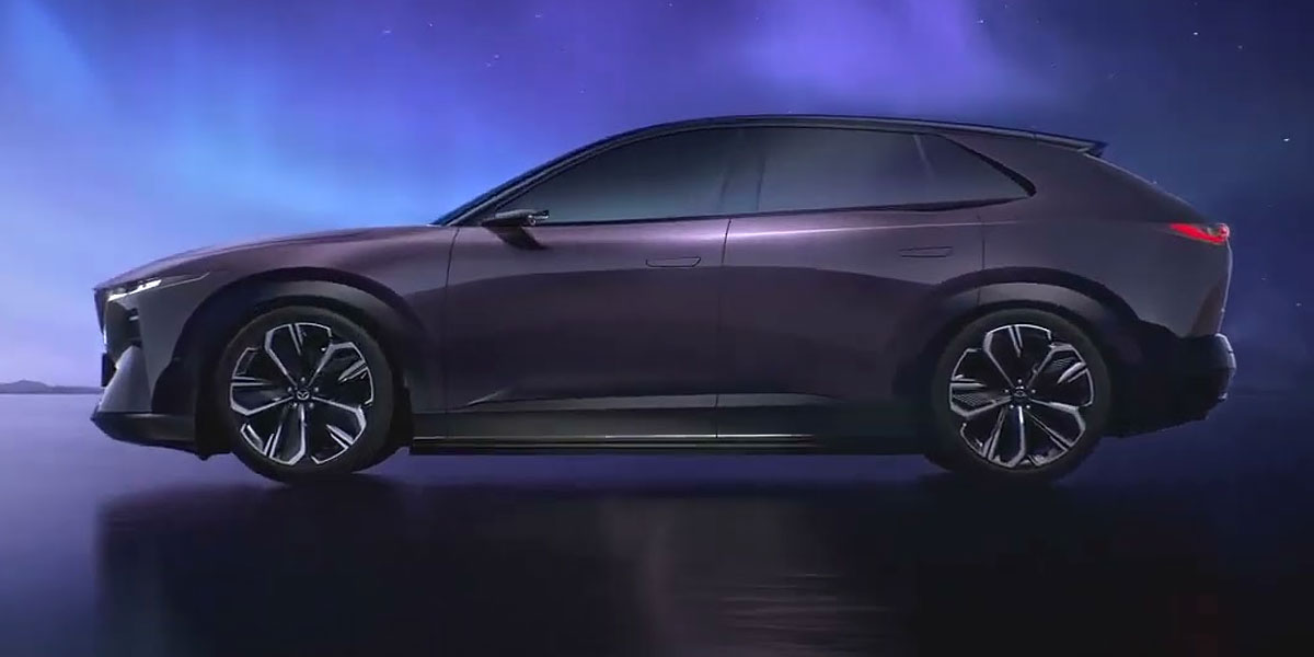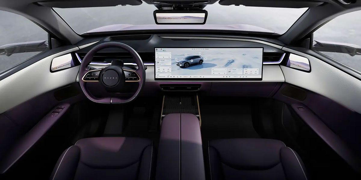 It’s a head-turner. The EZ-60 stretches 4,850 mm (190.9 inches) long and 1,935 mm (76.2 inches) wide, with a height of just 1,620 mm (63.8 inches), giving it a planted and sleek silhouette. Slim DRLs, a full-width light bar, and illuminated Mazda badge add drama, while the deep purple paint—meant to mimic a starlit sky—feels more upscale than expected. Aerodynamics are aided by hood inlets and D-pillar ducts. Optional 21-inch wheels wrapped in 255/40 tires complete the look, though markets outside China may get more conventional mirrors and wheel choices.