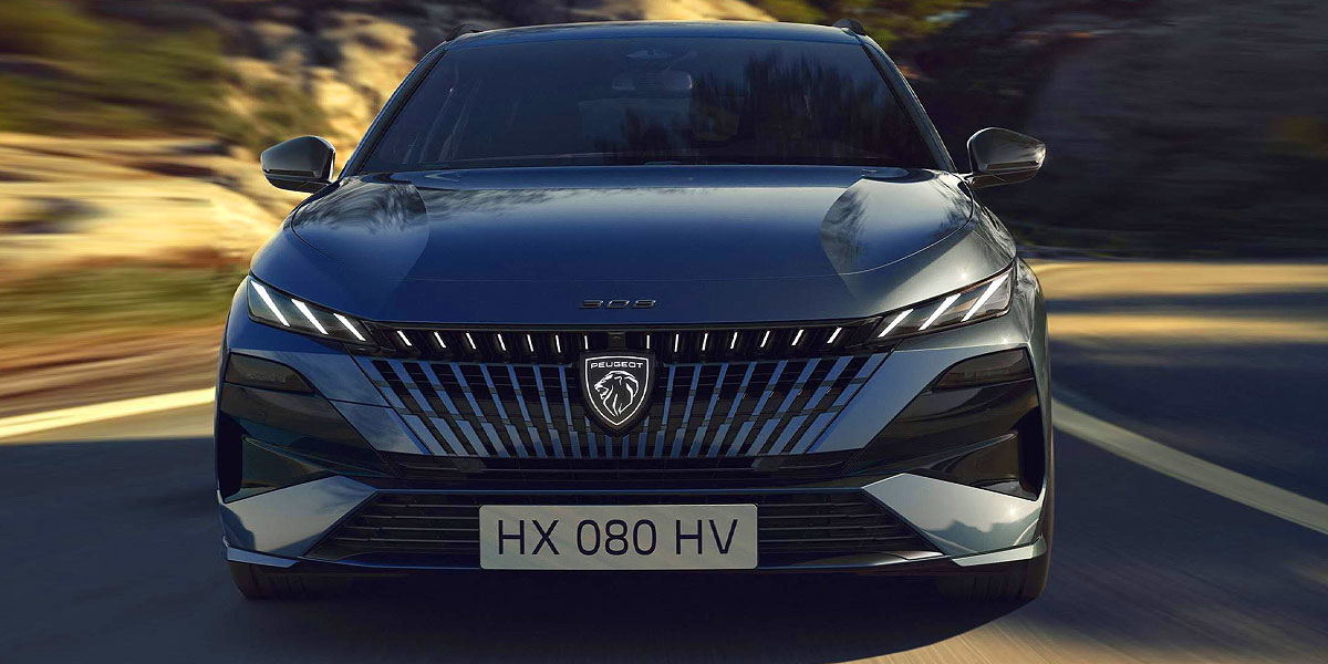 Matrix-style lamps (upper trims), three-claw signature, illuminated Peugeot badge