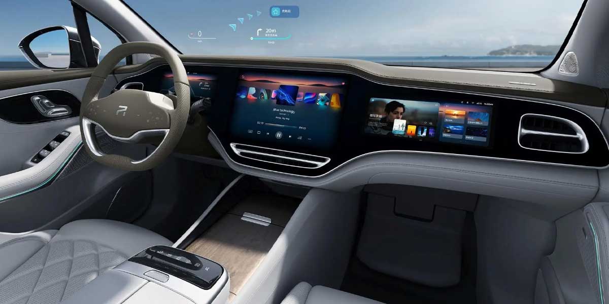 The sanctum of the R7 is a testament to futuristic design, equipped with a 43-inch triple-screen phenomenon, augmented by facial recognition and voice modulation capabilities. This interior is not just about the opulence but a homage to the technologically adept.