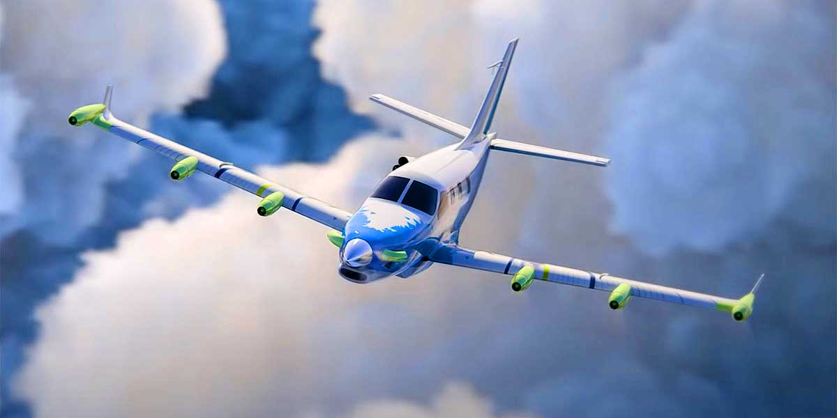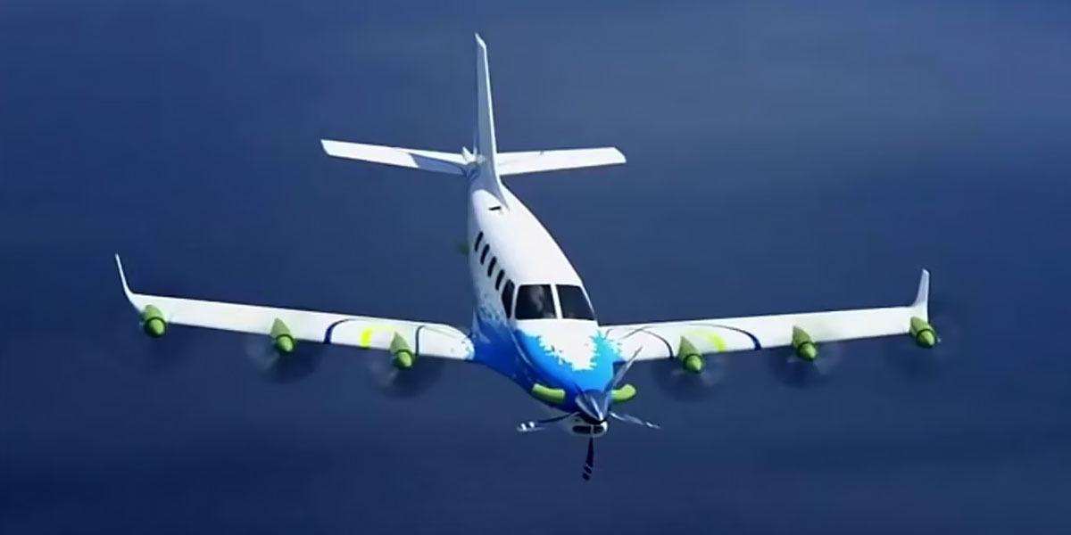 80 kWh battery, 350 kW distributed electric system delivering 470 hp. Hybrid range up to 1,600 km or 994 miles. Top speed 520 km/h or 323 mph. Six electric propellers optimize lift and reduce runway distance.
