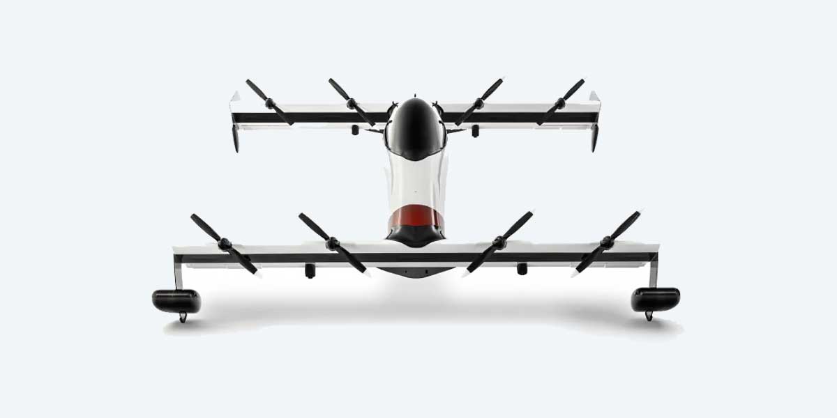 The airframe spans 4.27 meters in length and width, equivalent to 14 feet each direction. Carbon fiber composites shape the structure, trimming mass while preserving rigidity. Eight rotors sit across tandem wings in fixed alignment. Integrated floats support emergency water landings. The 270 degree panoramic canopy expands outward visibility, enhancing spatial awareness. Signature white panels contrast against exposed carbon fiber textures. Aerodynamic sculpting reduces drag during horizontal cruise. The entire configuration reflects a disciplined lightweight eVTOL design philosophy focused on efficiency.
